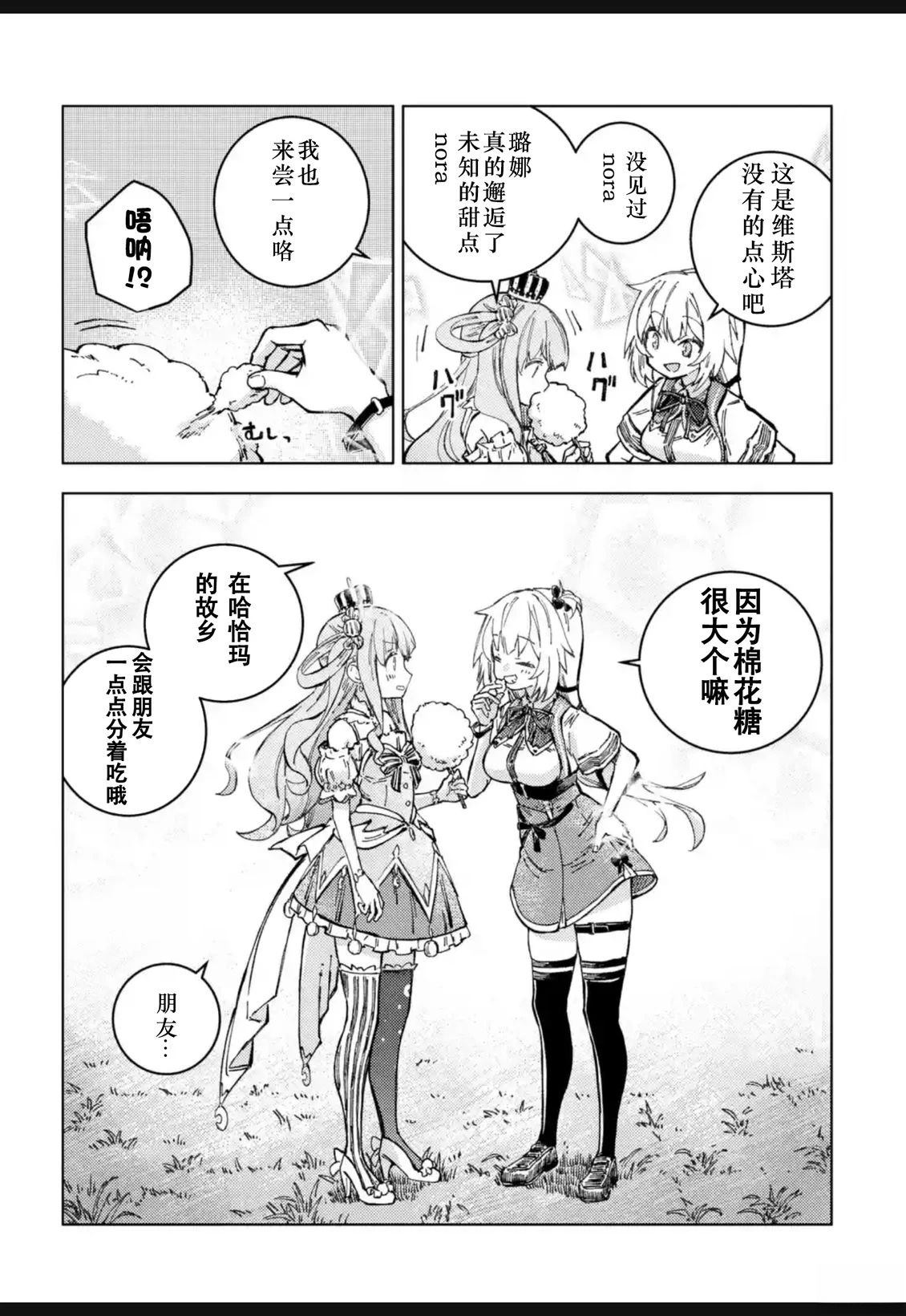 因为吃下自己亲手做的料理而受到冲击,被传送到异世界的少女「赤井心」,以及在异世界经营牧羊业、头上有角的少女「角卷绵芽」,还有人气咖啡馆「マチカドカフェ」的招牌女服务员「不知火芙蕾雅」,以及骑士团的团长「白银诺艾尔」。 少女们以「异世界的食谱」为契机相遇,在编织出无数笑容的同时,度过了一段幸福的时光[]光。这部作品以异世界创造企划「Hololive Alternative」的世界为舞台,实力派作家Johne将可爱又欢乐地描绘出这四位少女的异世界闹剧烹饪喜剧[-折叠]